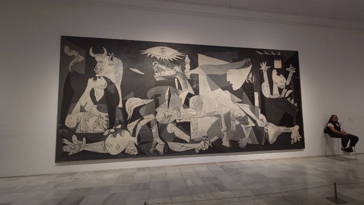 まずはソフィア王妃美術センターです。ここで見れるのはピカソの「ゲルニカ」。スペインは第二次世界大戦には参戦していない(はず)ですが、この当時内乱がありました。フランコ側の反乱軍がナチスドイツの力を借りて、世界で初めて市民に対する無差別爆撃を行った悲劇を描いた名画です。1937年に完成しました。