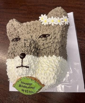 チベットスナギツネのケーキ♡先日の誕生日に院長からお祝いしていただきました。切れ長の目、独特な鼻と口のとんがり具合が何とも気になってしまいます。そんなクールな顔にお花の耳飾りがついてかわいいチベットスナギツネに変身。葉っぱはドロン用ですね!ありがとうございました!