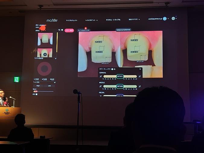 今年は2日を通して『色』をテーマに話されている技工士の方が多かったです。患者様のセラミックのかぶせ物を作る際に、特に前歯なら隣の歯とそっくりに作らなければ偽物の歯だな~とばれるわけです。そこで今までの技工士は長年の経験と熟練、匠の技を用いて色付けを行います。ですがそれができる技工士は一握りでどうすれば上達するんだろうなと思いながら葛藤している技工士がほとんどです。今回の講演の中では技術はもちろんですが、ベースとなる色味を決定するのはデジタル技術とコンピュータでありどこにどのように色を配置するとよいのかをきちんと数値で表してくれるという仕組みを利用した若い技工士さんの発表でした。