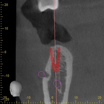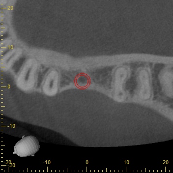 今回もCTスキャンで調べるとインプラントの外側に骨が足りないことが分かりました。足りない量がそれほど多くなかったためにインプラント埋め込みと同時に骨補填材を移植して骨造成をすることになりました。