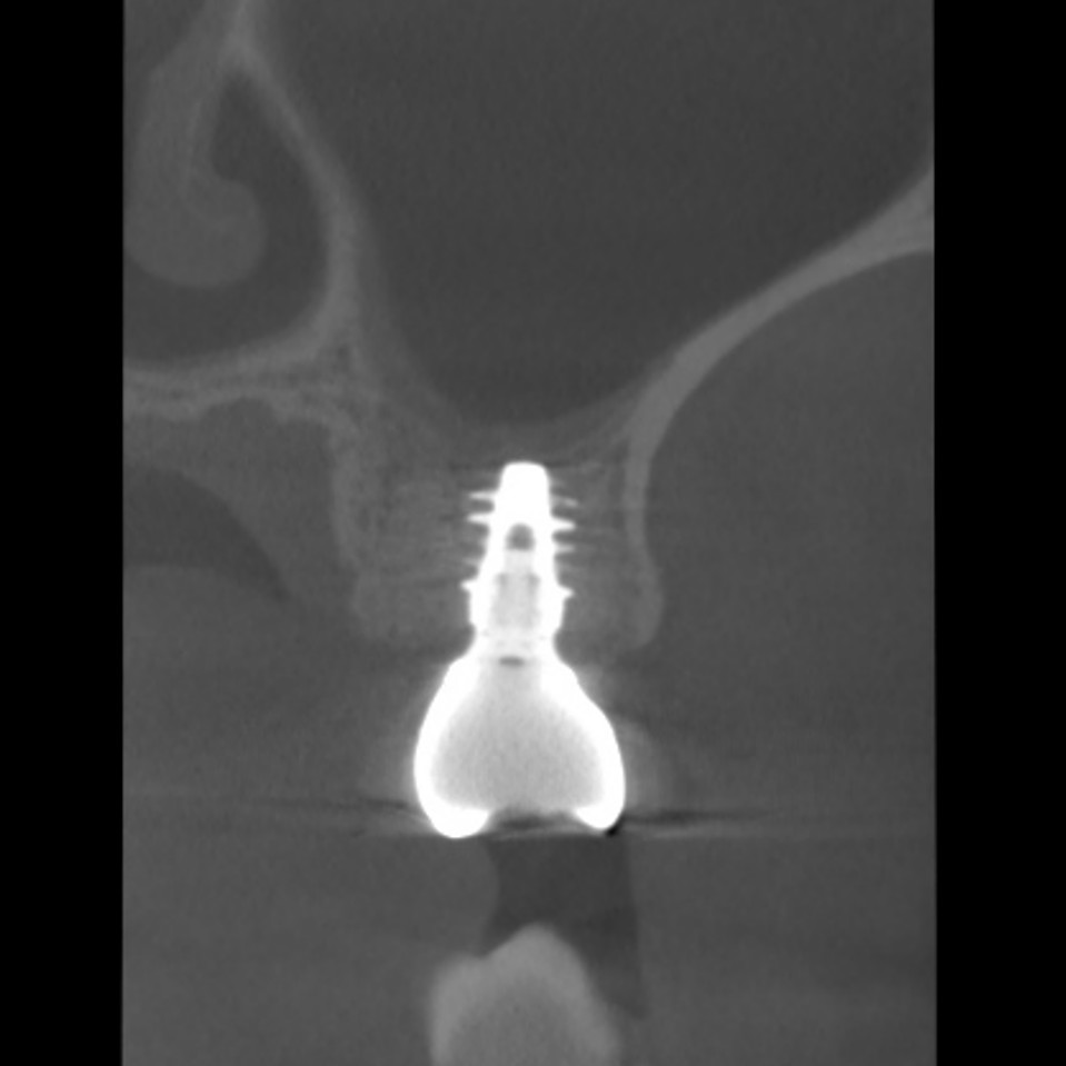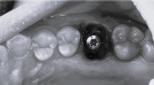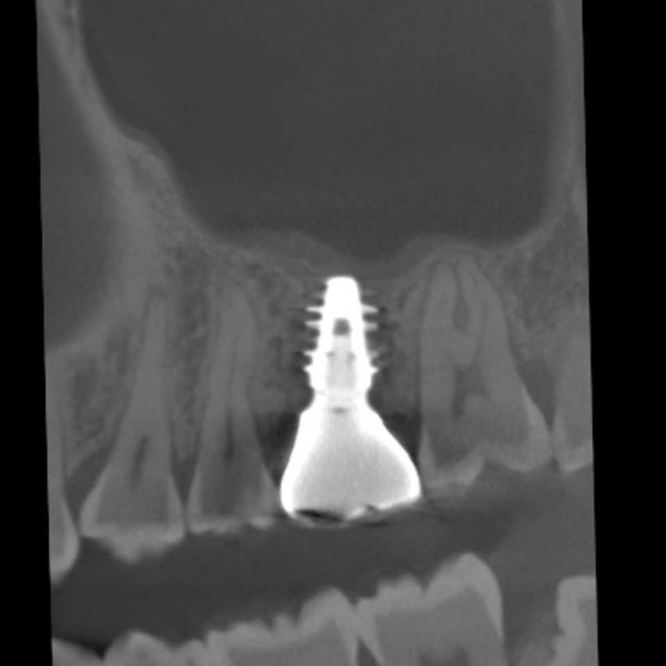 上の奥歯は上顎洞までの距離が短くインプラントが難しいことも多いのですが、即時埋入用に開発されたインプラントを使えば抜歯と同時にインプラント埋め込みまで行うことができると判断しました。